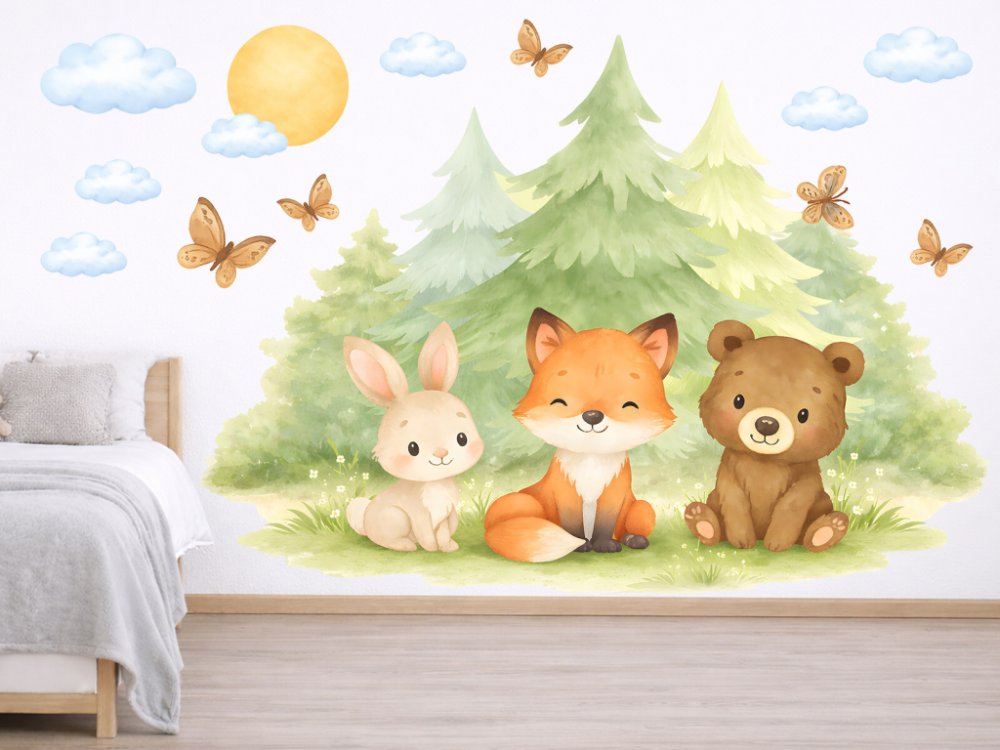 Samolepka na zeď Liška, zajíček a méďa přenese dětský pokoj do kouzelného lesního světa plného klidu, pohody a přátelství. Roztomilá trojice lesních kamarádů sedící před jemnými zelenými stromy působí mile, harmonicky a uklidňujícím dojmem, který je ideální pro vytvoření útulné atmosféry. Akvarelový styl ilustrace s měkkými pastelovými barvami, obláčky, motýlky a sluníčkem podporuje dětskou fantazii a navozuje pocit bezpečí a radostného snění. Motiv se krásně hodí do pokojíčku pro miminka i větší děti a snadno zapadne do přírodně, skandinávsky i neutrálně laděných interiérů. Zákazník obdrží arch s hlavním motivem lišky, zajíčka a méďi doplněným o samostatné dekorativní prvky, díky nimž lze vytvořit vyváženou a harmonickou kompozici podle vlastní představy. Celý design působí něžně, nadčasově a hřejivě a stane se krásnou dominantou dětského pokoje.
