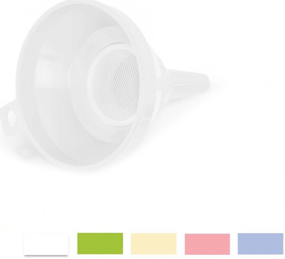 Tahle plastová nálevka o horním průměru 6 cm má navíc vyjímatelné sítko, díky němuž lze přecedit nechtěné kousky ze šťáv, sirupů nebo bylinných nálevů. Lze ji umývat v myčce nádobí.