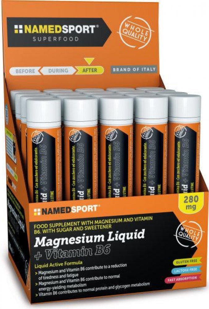 MAGNESIUM LIQUID + VITAMIN B6 je energetický nápoj s hořčíkem a s vitamínem C. Každé balení obsahuje 400mg hořčíku a 160mg vitamínu C. Hořčík je esenciální minerál, který je pro naše tělo mimořádně důležitý, neboť pomáhá v boji proti fyzické a duševní únavě a přispívá k lepšímu fungování svalů. Kromě toho podporuje syntézu bílkovin a fungování nervové soustavy. Vitamín C chrání buňky před oxidačním stresem a přispívá k normálnímu fungování imunitního systému v průběhu intenzivní fyzické aktivity i po ní. Super Magnesium Liquid se doporučuje užívat především ve fázi po cvičení.