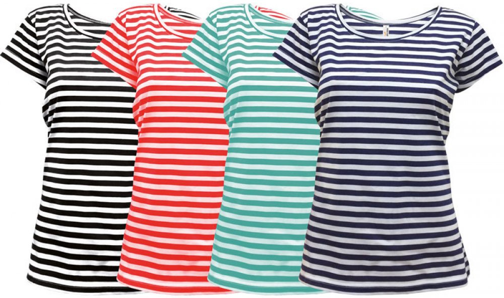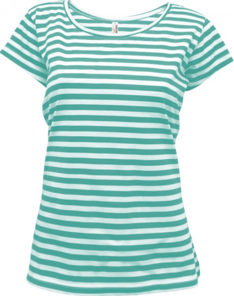 Velmi elegantní dámské triko s krátkými rukávy a kulatým průkrčníkem. Kvalitní materiál a trendové proužky jsou skvělým předpokladem pro maximální spokojenost zákazníků. Výrobek je vhodný pro potisk a výšivku.