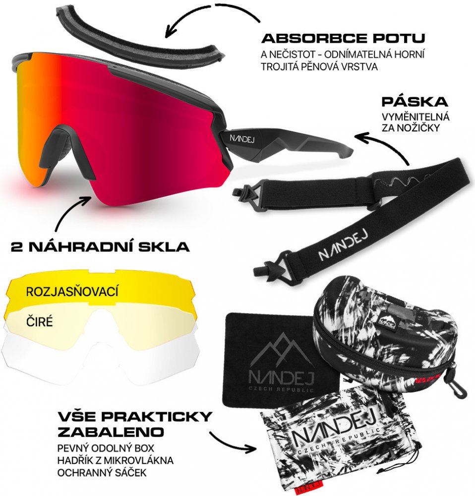 Součástí balení je PEVNÝ BOX se speciální přihrádkou na výměnná skla, sáček na brýle, lešťící hadřík na skla.