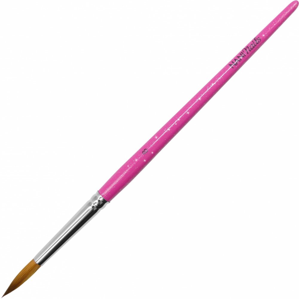 Profesionální kulatý štětec na akryl s přírodním vlasem v růžové lakované rukojeti s glitry a logem NaniNails. Vysoce kvalitní štětec vhodný pro použití na akryl. Vyrobeno v Německu. Rozměry: délka štětce 200 mm délka štětin 23 mm šířka štětin 5 mm