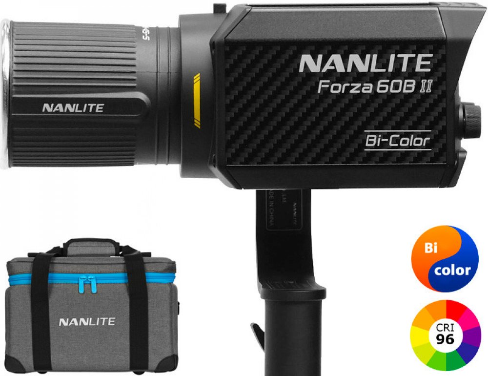 Převzetím kvality světla a kompaktní a lehké konstrukce modelů Forza 60 a 60B vylepšila společnost Nanlite výkon a univerzálnost druhé generace dvoubarevného LED světla Forza 60B II. Toto světlo nabízí intuitivní provedení, nastavitelnou teplotu barev 2 700–6500 K a je vybaveno 45° minireflektorem, uzamykacím portem DMX, vestavěnou technologií Bluetooth pro přímé bezdrátové ovládání prostřednictvím aplikace a tišším integrovaným ventilátorem. Kompaktní, ale výkonný