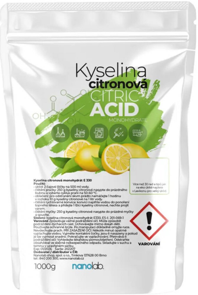 S kyselinou citronovou Nanolab snadno vytvářejte svěží přírodní čistící prostředky pro vlastní potřebu. Nyní můžete čistit svůj domov bez dalších chemikálií a toxinů, které se nacházejí v komerčních čističích. Čistěte snadno a dýchejte!