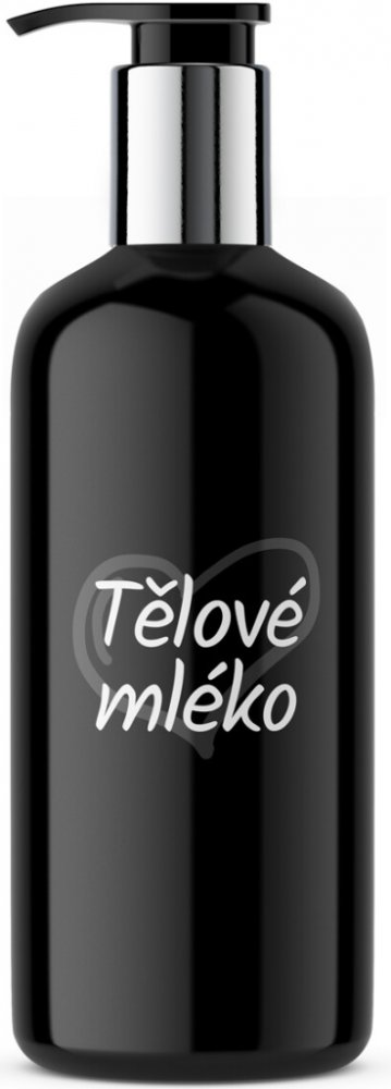 Lahvička s pumpičkou a etiketou "Tělové mléko"