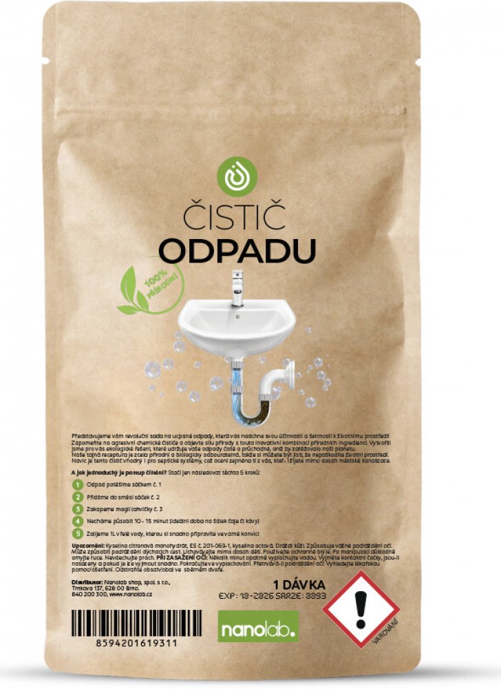 Balení obsahuje: 1 dávku Přírodní čistič ucpaného odpadu Nanolab 1 dávka od výrobce Nanolab v kategorii Čistění a úklid | Na odpady a septiky za skvělé ceny na e-shopu Alpik.cz