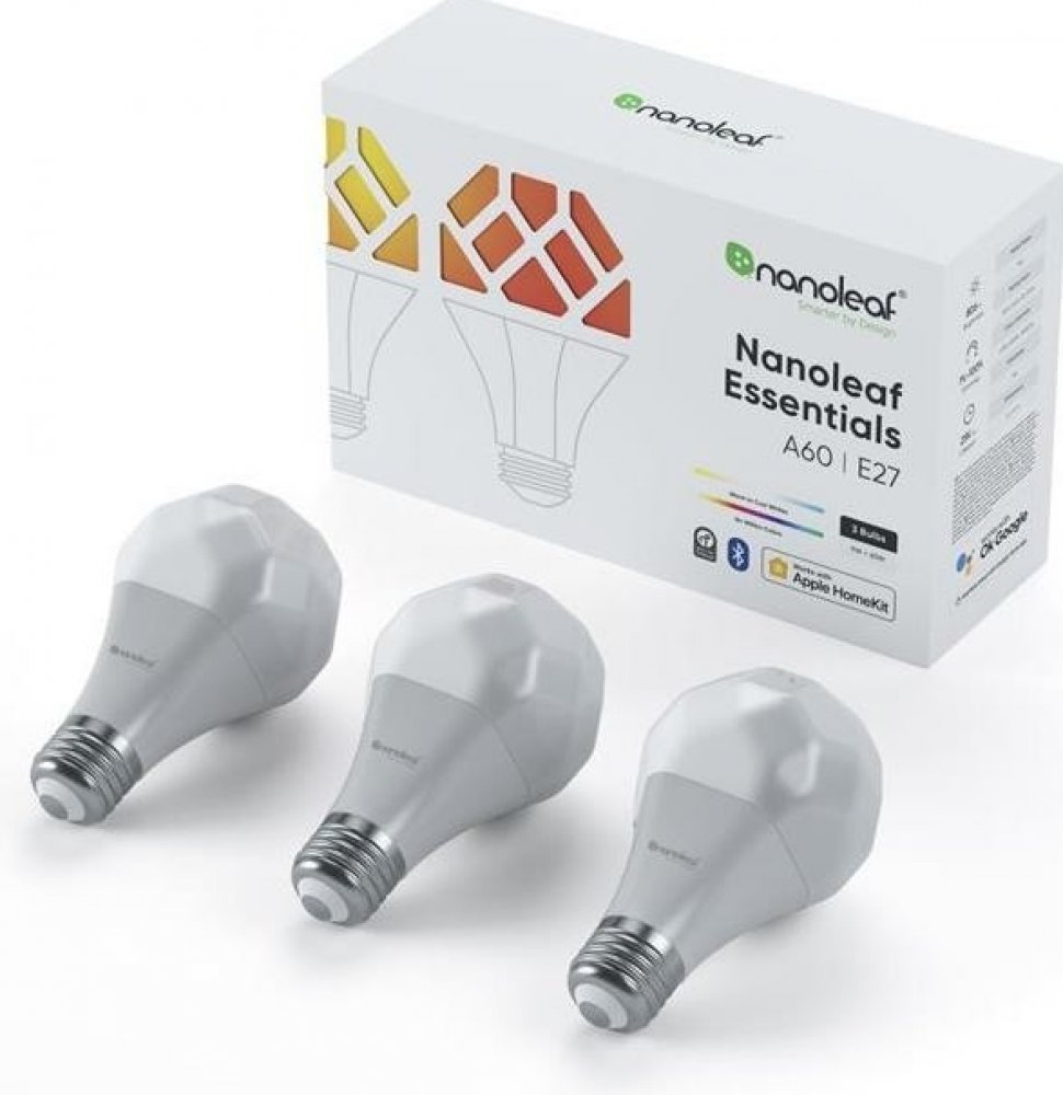 Nanoleaf chytrá žárovka E27, 3 ks chytrá žárovka s možností nastavení jasu, vyladění světelného vzhledu a nastavení z více barev RGB možnost dálkového zapnutí/vypnutí žárovky pomocí aplikace Nanoleaf není vyžadován žádný hub kompatibilní s Apple HomeKit a Google Assistant 25 000 hodin životnost 9W spotřeba energie Průměrný jas 806 lumenů Maximalní jas 1100 lumenů Balení obsahuje: žárovka