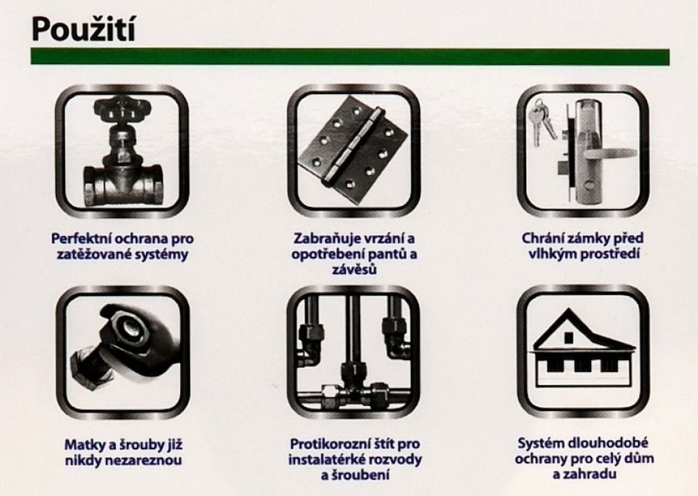 Na určený povrch stříkejte souvislou vrstvu (ze vzdálenosti 20-30 cm) nebo sprej použijte přímo na ošetřované místo (zatuhlé šrouby apod.)