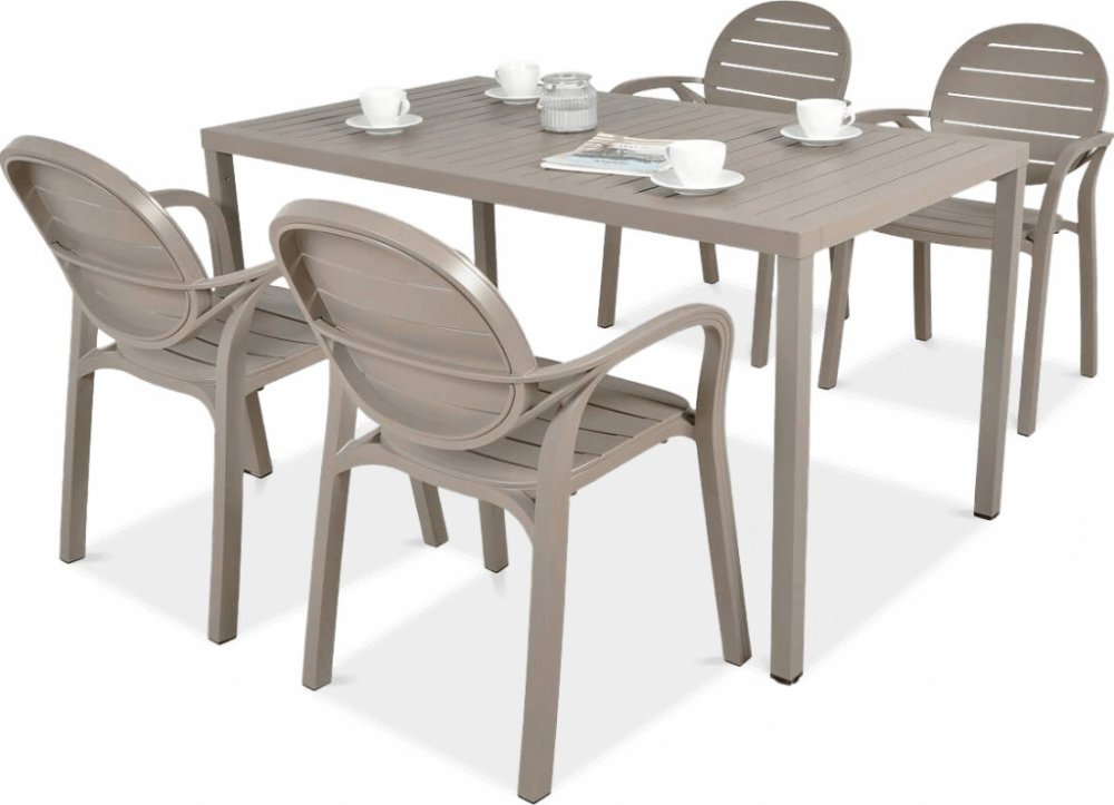 PopisExkluzivní sada zahradního nábytku Palma/Cube 4+1 Tortora splní očekávání i těch nejnáročnějších uživatelů. Pětidílná sada výrobků od renomované italské značky Nardi bude dokonalým vybavením během opulentní zahradní party. Zahradní set Palma/Cube se skládá ze 4 pohodlných židlí a 1 funkčního stolu. Veškerý nábytek je v elegantní světlé jasanové barvě a rafinovaný design dodává celé sadě jedinečný charakter. Jasně definované tvary stolu Nardi Cube skvěle doplňují řadu židlí Nardi Palma. Veškerý nábytek v zahradní soupravě je vytvořen z mimořádně odolných a zároveň snadno udržovatelných materiálů.Stůl je směsí práškově lakovaného hliníku a moderního kompozitu DurelTop, zatímco židle jsou vyrobeny ze 100% polypropylenu vyztuženého skleněnými vlákny. Díky této kombinaci bude souprava Palma/Cube 4+1 Tortora i po několika letech vypadat, jako by právě sjela z výrobní linky. Zapomeňte na změnu barvy povrchu v barvě popela, která by se u jiného nábytku objevila v důsledku UV záření nebo srážek. Zahradní soupravu Palma/Cube 4+1 lze snadno udržovat v perfektním stavu - obvykle stačí jen trocha vody. Souprava nábytku Nardi splňuje také náročné bezpečnostní normy. Certifikace CATAS znamená, že souprava Palma/Cube Tortora je dokonale vhodná pro profesionální použití. Pro firmy působící v oblasti HoReCa jsme na FocusGarden připravili výjimečnou nabídku. Je třeba také zdůraznit funkční vlastnosti představené sestavy zahradního nábytku. Nastavitelná výška nohou stolu, protiskluzové konce nebo stohovatelné židle jsou jen některé z praktických výhod. Nečekejte a objednejte si zahradní set Palma/Cube 4+1 Tortora v obchodě FocusGarden ještě dnes!Vlastnosti výrobkuZahradní nábytek PALMA/CUBE 4+1 Tortora je navržen italskou značkou Nardi, která vyrábí nejlepší prémiový nábytek v Evropě.Židle jsou vyrobeny z polypropylenové pryskyřice, která je navíc vyztužena skelnými vlákny pro maximální odolnost.Stůl je směsí práškově lakovaného hliníku (nohy) a moderního kompozitu DurelTop na bázi polypropylenové pryskyřice (deska).Nohy jsou opatřeny protiskluzovým plastem, který zajišťuje bezpečnost na mokré terase, a navíc lze nohy stolu vyrovnat pro nerovný terén.Židle jsou stohovatelné, což je důležité, když je málo místa a je důležitá mobilita.Zahradní souprava byla navržena pro intenzivní používání a vyznačuje se vynikající odolností proti povětrnostním vlivům a UV záření.Nábytek se velmi snadno udržuje v čistotě, stačí jej omýt vodou ze zahradní hadice nebo použít vlhký hadřík.Nejvyšší kvalitu zahradního nábytku Nardi potvrzuje i speciální certifikát udělený výzkumným ústavem CATAS, který informuje, že provedené testy odolnosti doporučují nábytek pro použití ve velkých veřejných zařízeních, jako jsou hotely, restaurace, aquaparky a další volnočasová centra.RozměryŽidle: šířka - 59 cm, hloubka - 56,5 cm, výška - 86 cmStůl: délka - 140 cm, šířka - 80 cm, výška - 74,5 cm