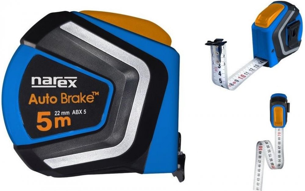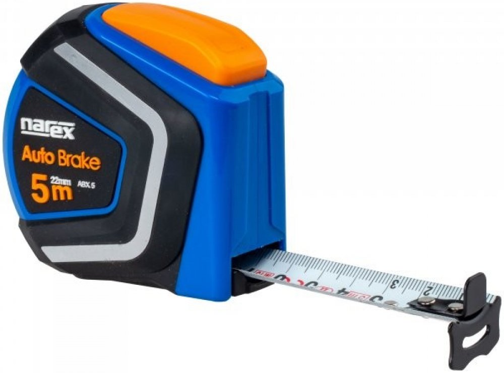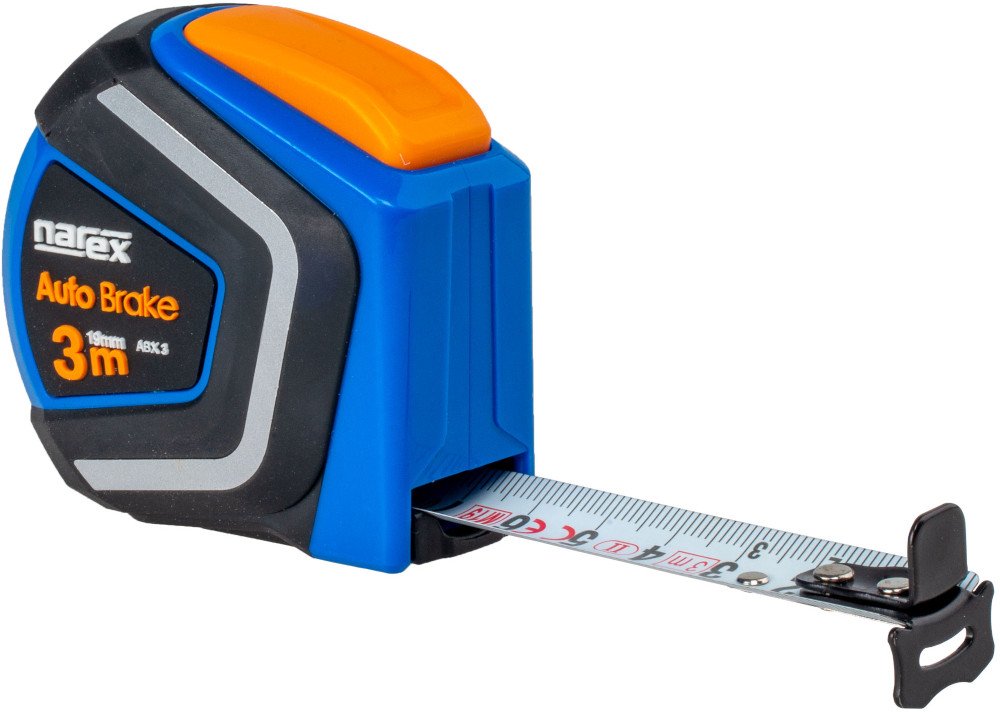 Ergonomický svinovací metr NAREX je z pružného ABS plastu s pogumovanou úchopovou plochou a velkoplošným tlačítkem pro uvolnění aretace pásma