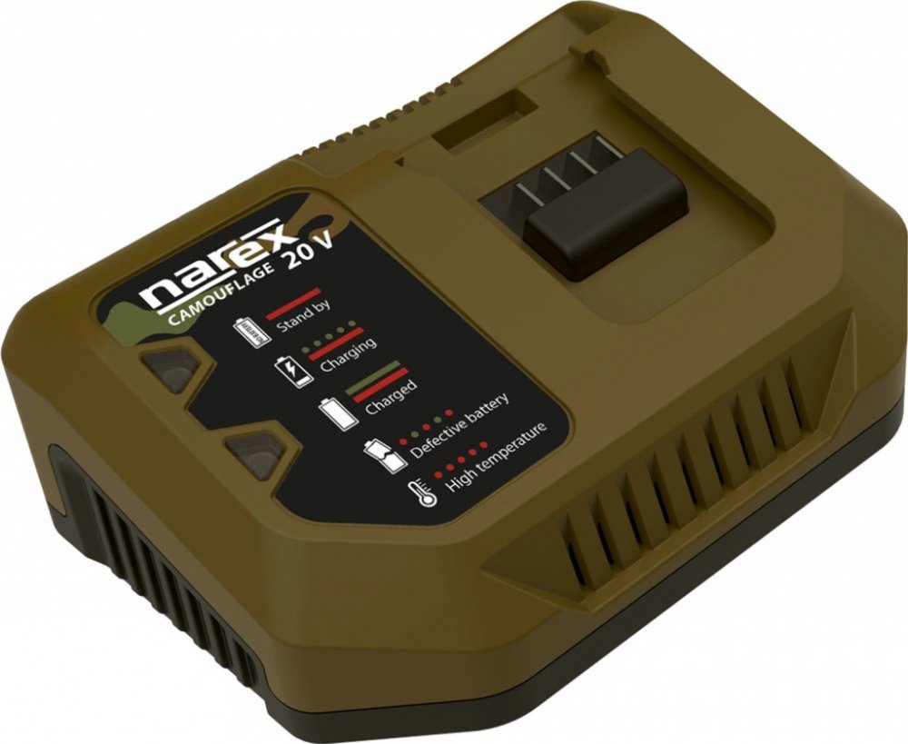 Nabíječka CN 20 z řady CAMOUFLAGE od značky Narex je vhodná pro svítilnu a stroje z té týž produktové řady. Nabití akumulátoru CB 4 trvá přibližně 60 minut. Nabíjecí proud činí 4,0 A a hmotnost 460 g. Nabíječka disponuje indikátorem stavu nabití pro perfektní přehled.
