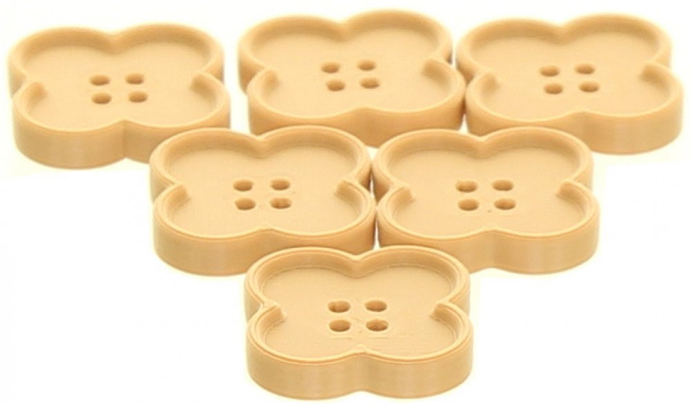 Dekorativní knoflíček ve tvaru kytičky, čtyřdírkový. Vyrobena 3D tiskem za použití materiálu PLA plus.