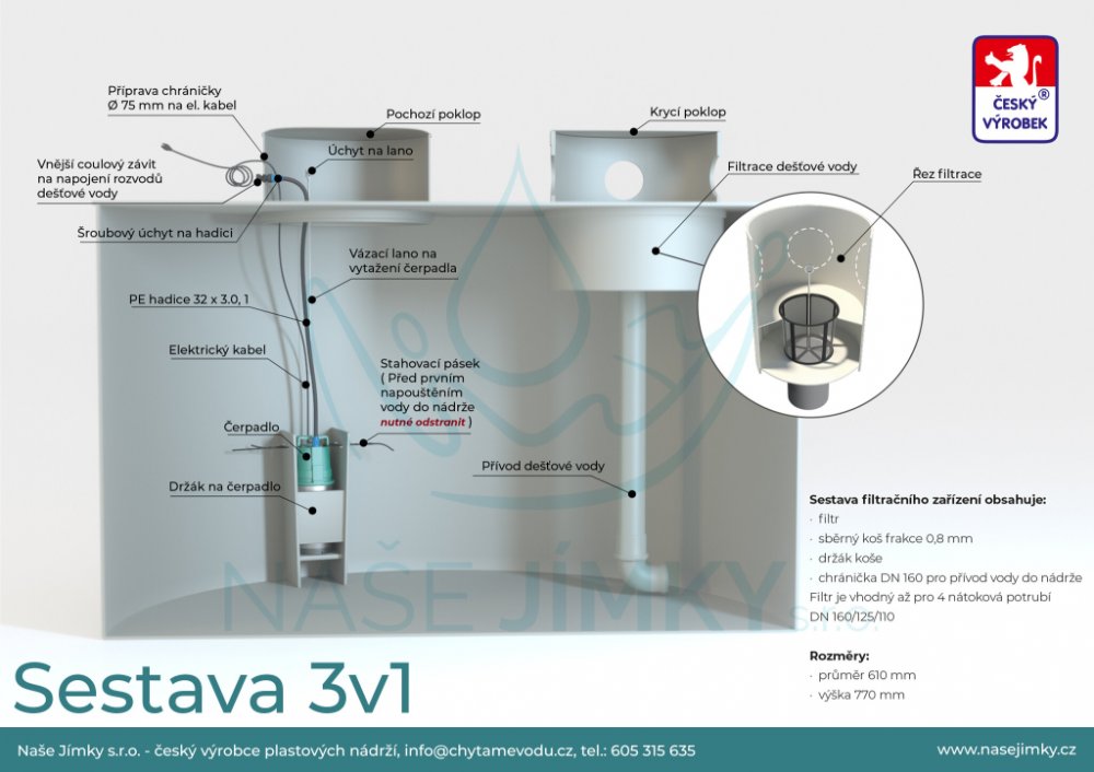 Plastová uzavřená nádrž z polypropylenu určená k uchovávání dešťové vody. Lze užívat na zálivku zahrady a jiné účely, tam kde stačí užitková voda. Voda ze střech je svedena do nádrže a odčerpává se čerpadlem.