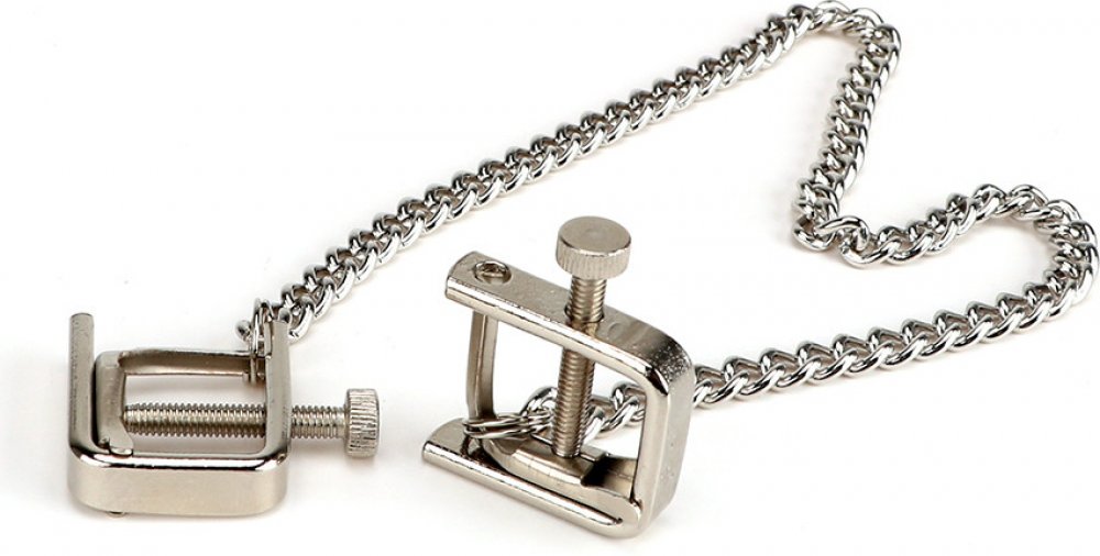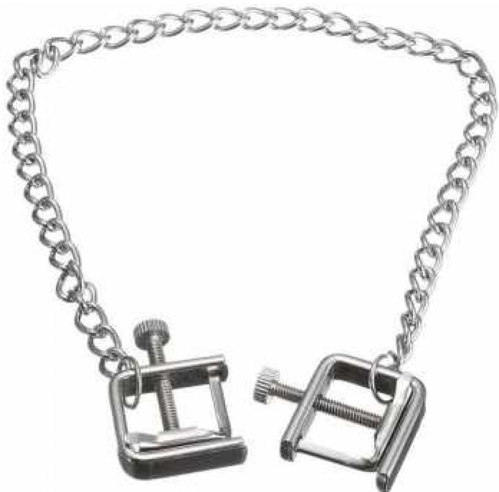 Svorky na bradavky s řetízkem. Díky šroubům lze nastavit libovolné sevření bradavek. Řetízek poskytuje dodatečnou stimulaci, když se pohupuje a tak za bradavky tahá.Vhodné pro ženy i muže.Rozměry: celková délka (řetízek včetně svorek) 41 cm, svorky 2,7 x 2,4 x 0,8 cm, délka šroubů 2,8 cmBarva: stříbrnáMateriál: pochromovaný kov