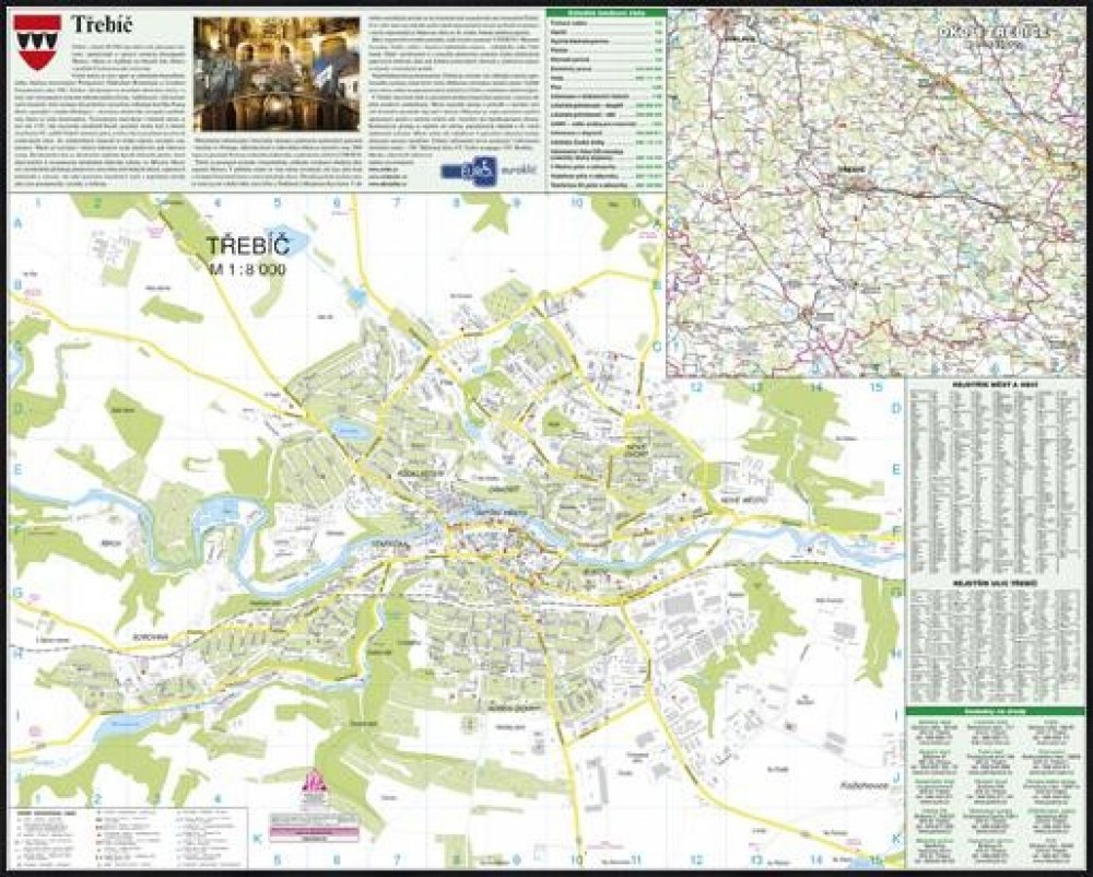 Mapa města Třebíč v měřítku 1 : 8 000 s mapou okolí v měřítku 1 : 165 000, rozměr mapy 90 x 72 cm, rejstřík ulic na mapě.