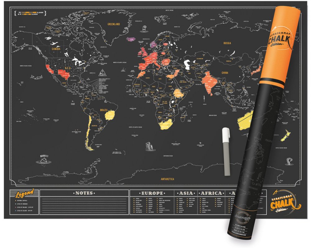 Rádi byste si svou stírací mapu personalizovali ještě více? Nyní dostáváte tuto možnost s nástěnnou stírací mapou Scratch map chalk edition. Nejen, že můžete již tradičně stírat navštívené země pomocí vaší oblíbené mince. Nově můžete také díky křídovému peru, které je součástí balení, značit vaše budoucí plány, psát poznámky nebo kreslit nejrůznější malůvky přímo do mapy! A pokud plány změníte, nic se neděje, jednoduše hadříkem zaznačené poznámky smažte a začněte nanovo. Mapa je dodávána v úhledné a stylové tubě – ideální jako dárek. Rám není součástí balení.