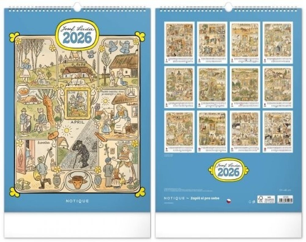 Nástěnný kalendář s ilustracemi Josefa Lady a jeho pohádkovými motivy je vyhotoven v oblíbeném velkém formátu, který osvěží každý interiér. V kalendáři je rovnocenně zahrnuta čeština a slovenština, ilustrace doplňují česká a slovenská jména, svátky, památné dny a fáze měsíce. Každý den má prostor pro poznámky, víkendové dny jsou barevně odlišené od pracovních.