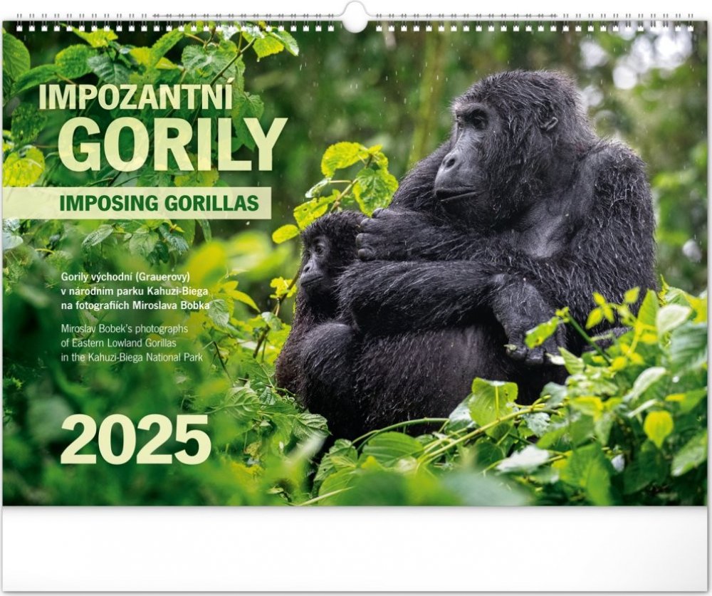 Dvanáct působivých snímků zachycujících krásu goril v šířkovém formátu. Fotografie jsou doplněny jednoduchým kalendáriem na černém pozadí.