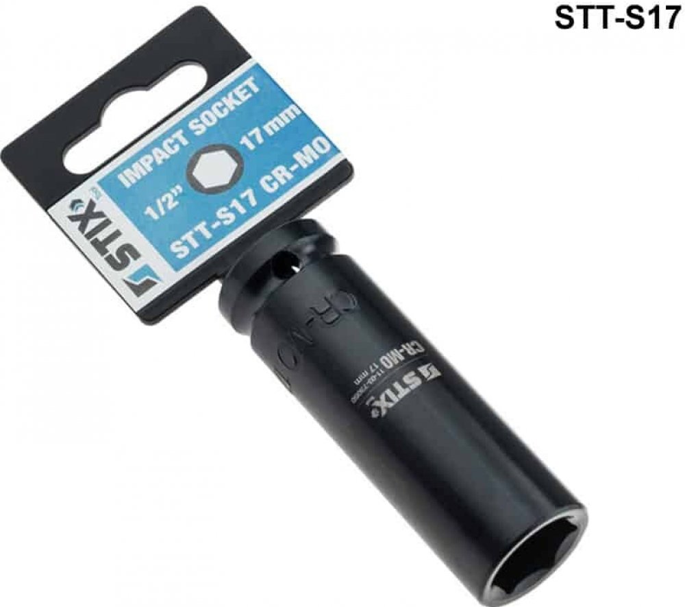 Speciální rázový nástrčný klíč STIX STT-S17, CR-MO/17 mm (ořech) na kolové šrouby a matice na alu kola lze použít s pneumatickými klíči (rázovými utahovacími pistolemi). Nezbytné nářadí do vaší dílny. Nástrčné klíče lze na klíč zaaretovat kuličkovou pojistkou nebo čepem a kroužkem (v závislosti na provedení klíče).