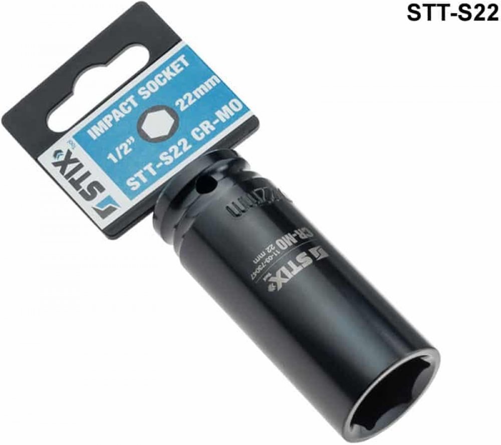 Speciální rázový nástrčný klíč STIX STT-S22, CR-MO/22 mm (ořech) na kolové šrouby a matice na alu kola lze použít s pneumatickými klíči (rázovými utahovacími pistolemi). Nezbytné nářadí do vaší dílny. Nástrčné klíče lze na klíč zaaretovat kuličkovou pojistkou nebo čepem a kroužkem (v závislosti na provedení klíče).