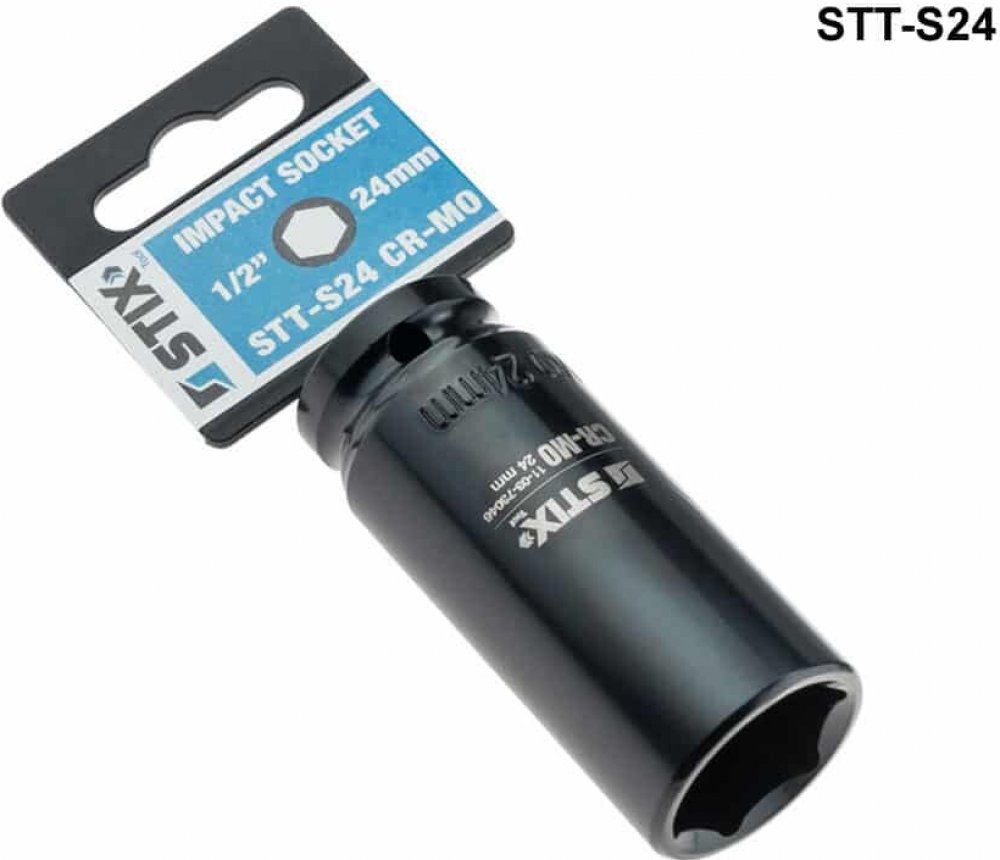 Speciální rázový nástrčný klíč STIX STT-S24, CR-MO/24 mm (ořech) na kolové šrouby a matice na alu kola lze použít s pneumatickými klíči (rázovými utahovacími pistolemi). Nezbytné nářadí do vaší dílny. Nástrčné klíče lze na klíč zaaretovat kuličkovou pojistkou nebo čepem a kroužkem (v závislosti na provedení klíče).