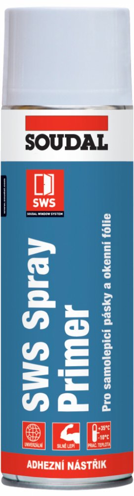 SWS Spray Primer je speciální rychleschnoucí adhezní nástřik v aerosolovém balení připravený k okamžitému použití. Je určený pro zvýšení přilnavosti samolepicích pruhů Okenních fólií nebo Expanzních pásek na běžné stavební povrchy. Balení ve spreji zajišťuje kvalitní, snadnou a rychlou práci při realizaci SOUDAL WINDOW SYSTEM. Speciálně navržen pro práci při aplikaci samolepicích pásek na mírně zaprášené, podchlazené nebo vlhké povrchy.