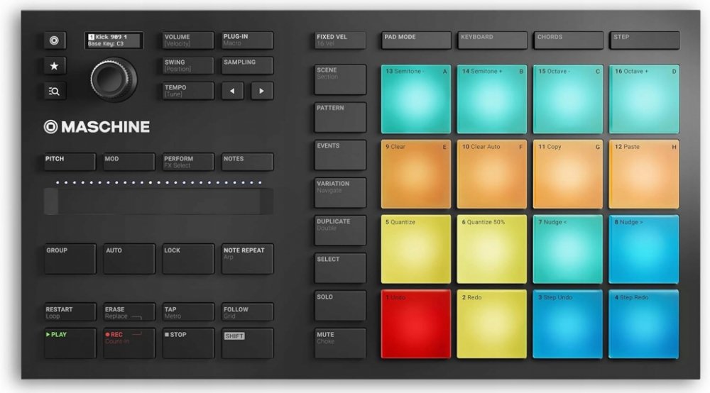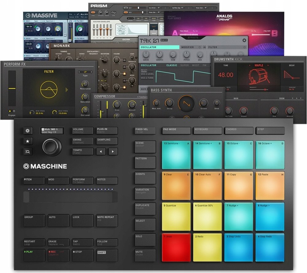 - 1,6 GB MASCHINE Factory Selection samplů, smyček, nástrojů, presetů, patternů, bicích sad a skladebstejný software jako u MASCHINE MK3/STUDIO/JAM – obsahuje 25 profesionálních efektů včetně filtru, EQ, delay, reverbu a kompresoru