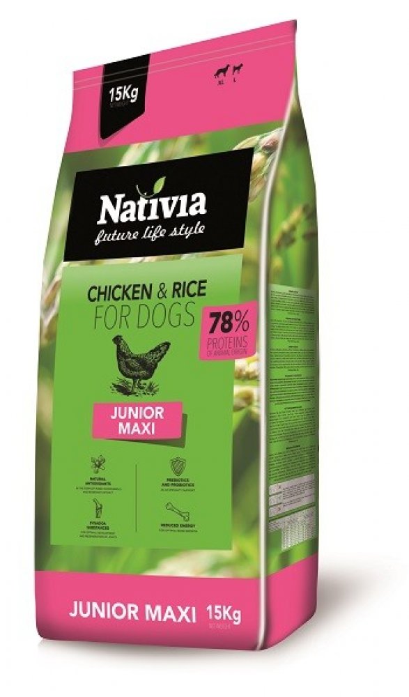 Receptura respektuje přirozené zákonitosti výživy psa. Obvyklá kombinace obilovin či brambor je zcela nahrazena pouze kvalitní rýží. Ta svojí stravitelností a profilem aminokyselin tyto tradiční suroviny převyšuje, nezatěžuje organismus a společně s ostatními komponentami výrobku zajistí zdravou výživu psa. Nativia Junior maxi v řadě Chicken&rice obsahuje 78% bílkovin živočišného původu a řadí se tak mezi přední značky na trhu.