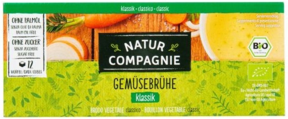 Natur Compagnie Bujon kostky zeleninové BIO - bujon v BIO kvalitě pro široké využití Zeleninový bujon Natur Campagnie pochází z kontrolovaného ekologického zemědělství, které zaručuje BIO kvalitu, vynikající chuť a autentické aroma produktu. Bujon je určen do polévek, k dochucení omáček a mnoho dalších pokrmů. Natur Compagnie Bujon zeleninový kostky BIO v bodech: 12 kostek bez přidaného glutamátu ...