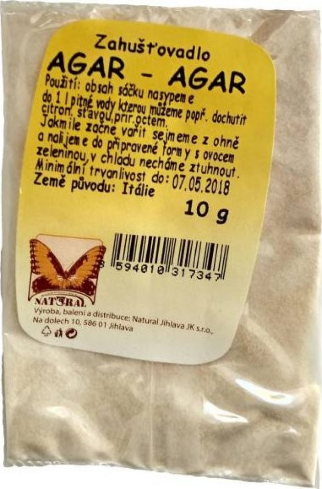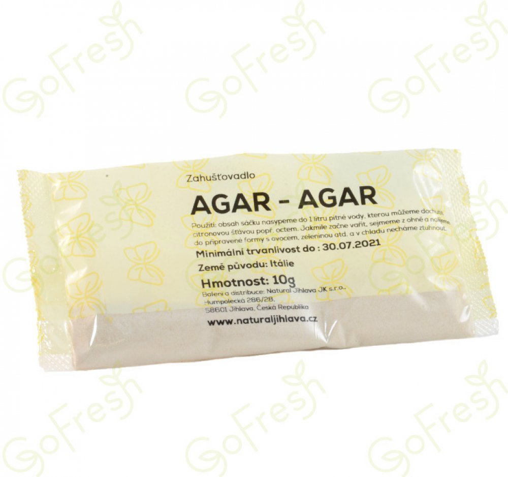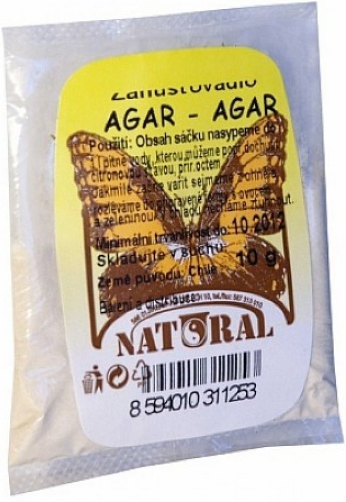 Použití:1. Náhrada za klasickou želatinu: k přípravě marmelád, ovocných past, zmrzlinových pohárů, zavařenin nebo falešné paštiky. Množství 10g vsypat do 1 litru pitné vody, kterou dle potřeby ochutit. Poté dát vařit a po dosažení bodu varu odstavit a nalít do připravené formy např. s ovocem. Poté nechte zatuhnout.2. K regeneraci zažívání - 1 lžíce agaru do sklenice s vodou. Vypít před jídlem.