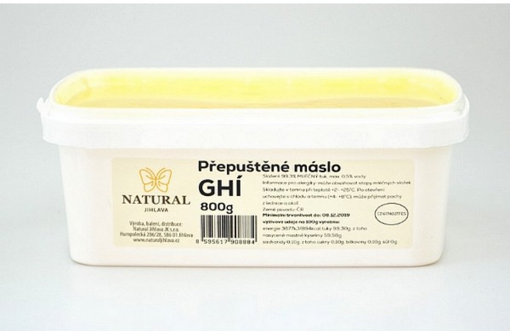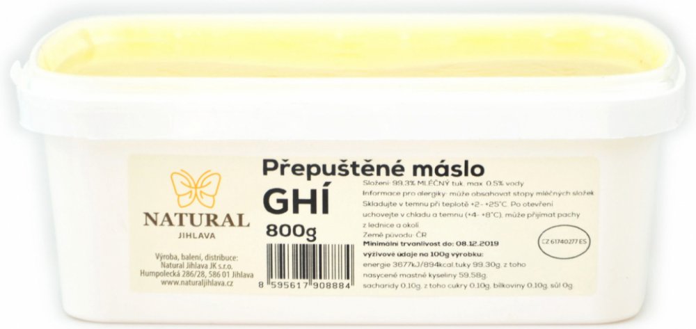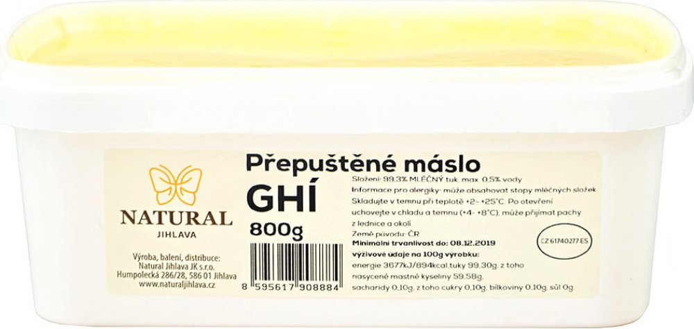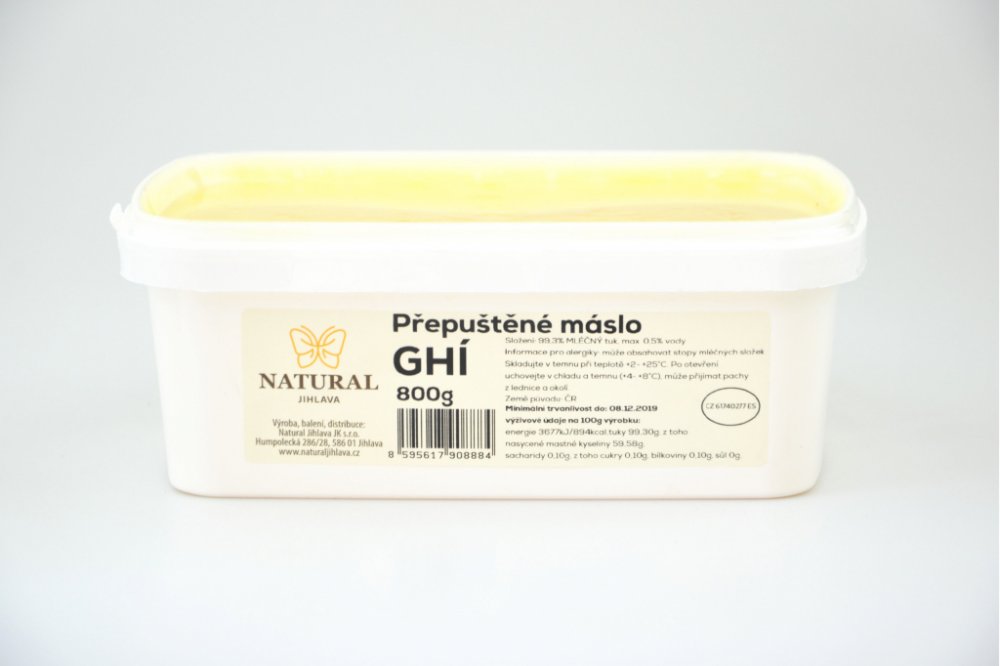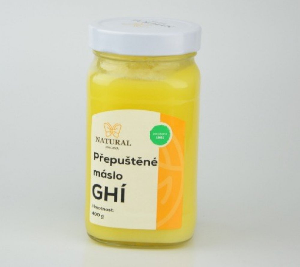 Přepuštěné máslo GHÍ Natural Jihlava je čistý mléčný tuk získaný šetrným způsobem, který zachovává chuť i výživové hodnoty. Díky vysokému bodu přepálení se nepřipaluje a je ideální pro smažení, pečení i studenou kuchyni. Ghí je přirozeně bezlaktózové, snadno stravitelné a dodá pokrmům jemnou máslovou chuť.