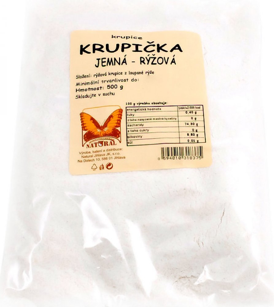 Jemná rýžová krupička je vyrobena z rýžové mouky vysoké kvality. Je přirozeně bezlepková, velice výživná a lehce stravitelná. Lze ji využít na přípravu dětské rýžové kaše, na pečení pečiva a sušenek, k vysypání pečících forem, na výrobu těstovin, nebo třeba k zahušťování.