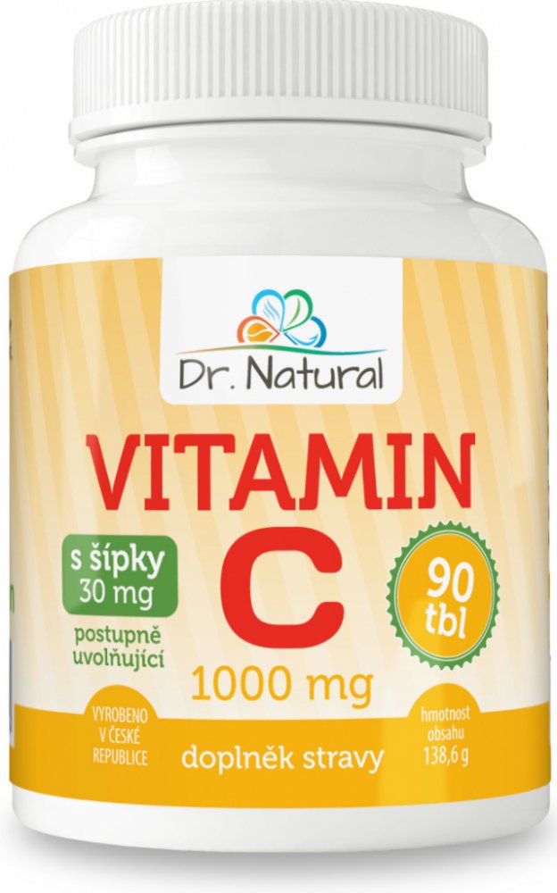 Dr.Natural Vitamín C s šípky 1000mg 90 tablet Vitamin C přispívá ke správné funkci nervového systému, ke snížení míry únavy a vyčerpání a k normální tvorbě kolagenu pro správnou funkci kostí, chrupavek, pokožky, dásní a zubů. Spolu se šípky přispívají k podpoře přirozené obranyschopnosti organismu.