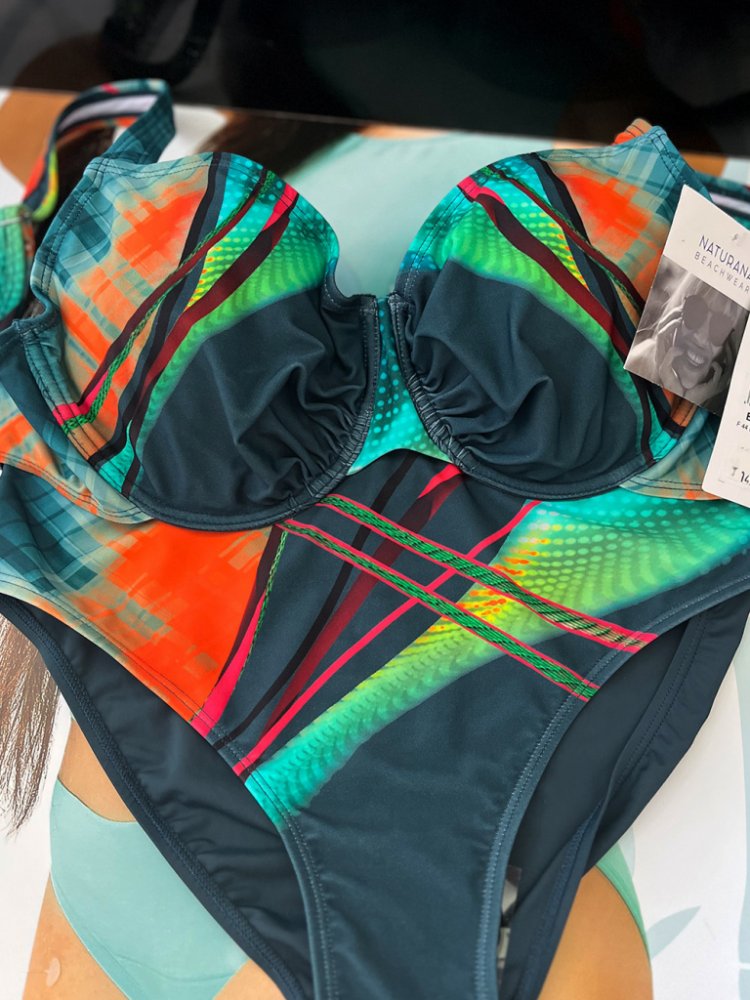 Dvoudílné plavky, košíčky s kosticemi, klasický střih kalhotek. Košíčky nemají žádnou výztuž, která do sebe natáhne během plavání velké množství vody, přesto díky materiálu perfektné drží poprsí, a to i ve větších velikostech.