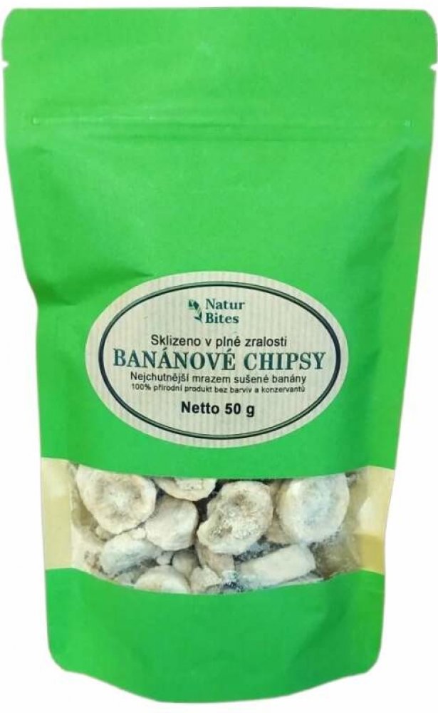 Banánové chipsy (plátky banánů) NaturBites, jsou mrazem sušené zralé a velice chutné banány sklizené v jižní Americe.