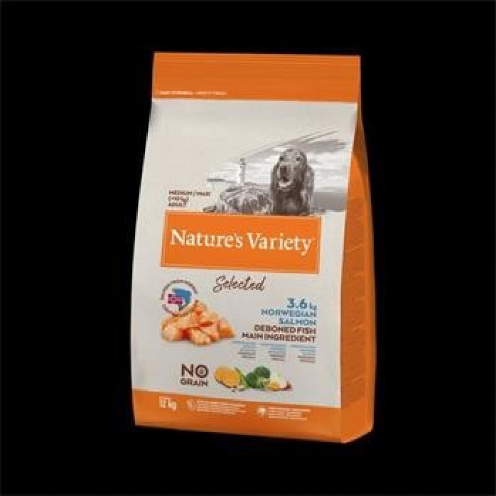 Nature´s Variety Selected pro střední psy s lososem je kompletní krmivo v podobě granulí pro dospělé psy středních a velkých plemen nad 10 kg s obsahem 30 % chutného norského lososa.