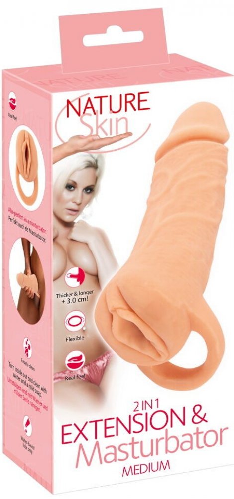 Nature Skin 2v1 Extension + Masturbator MEDIUM je inovativní erotická pomůcka, která kombinuje prodlužovací návlek na penis s masturbátorem ve tvaru vagíny, aby poskytla autentický a intenzivní zážitek. Tento masturbátor je vyroben z měkkého materiálu Nature Skin, který věrně napodobuje lidskou pokožku a zajišťuje realistický dotek a pocit. Realistický vzhled zahrnuje vzrušující texturu uvnitř i vně, s výraznými stydkými pysky a žilnatým rukávem. Elastický a pružný materiál se dokonale přizpůsobí velikosti a pohybům, zatímco kuličkový kroužek poskytuje bezpečné uchycení a přidává vzrušující napětí. Uvnitř je intenzivní stimulační textura, která maximalizuje potěšení během ruční práce i sexu. Prodlužovací úroveň přidává na velikosti a zvyšuje sebevědomí. Po použití lze masturbátor jednoduše otočit naruby pro snadné a důkladné čištění.