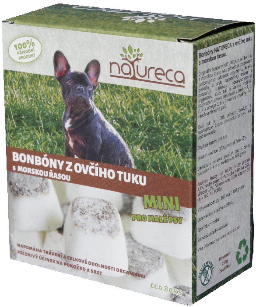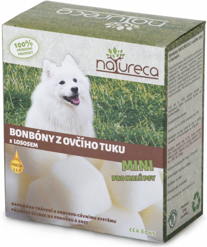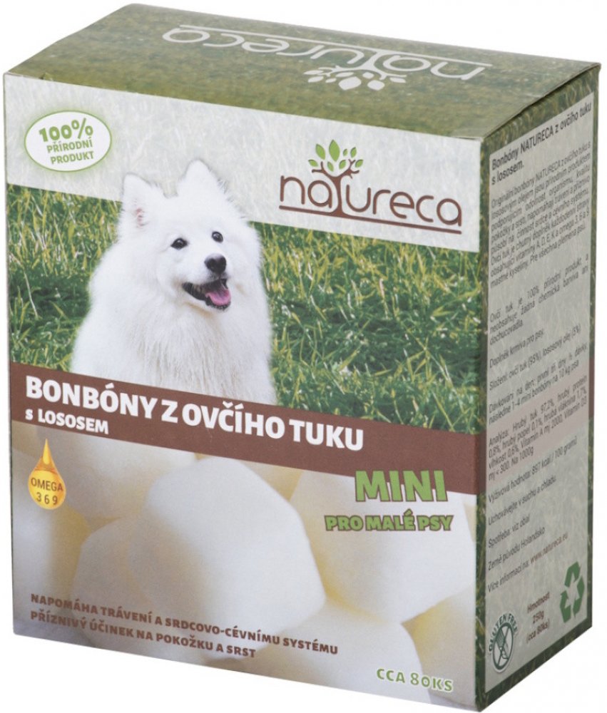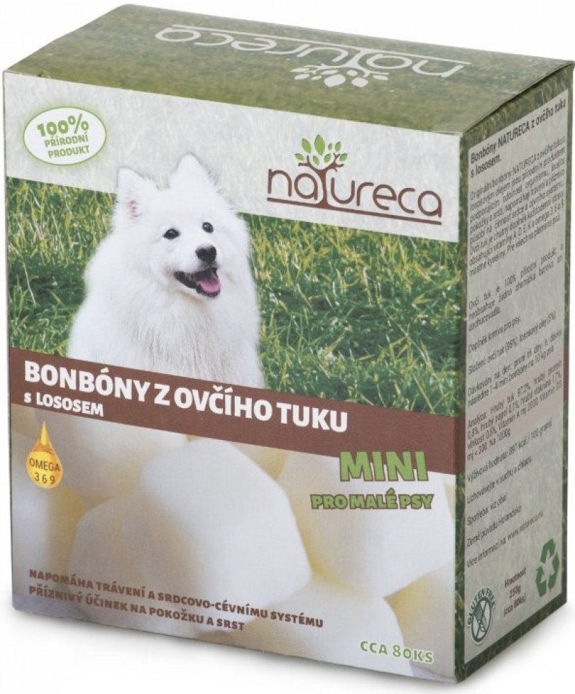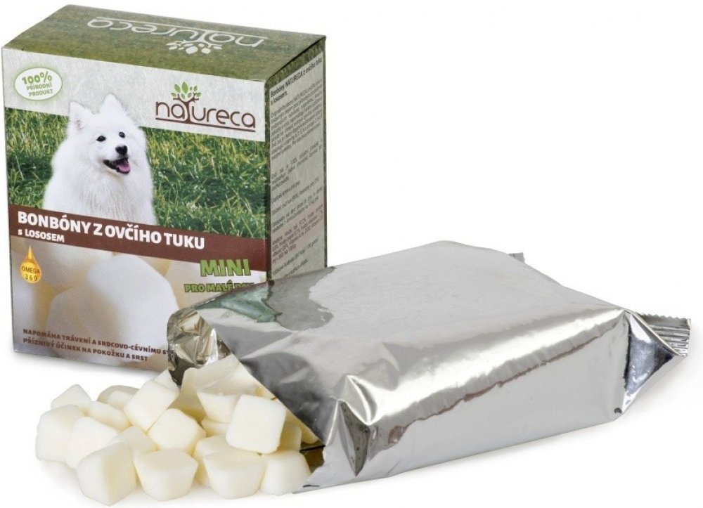 Originální bonbony z ovčího tuku s lososovým olejem NATURECA jsou přírodním produktem podporujícím odolnost organismu, kvalitu pokožky a srsti, napomáhají trávení a příznivě působí na činnost srdce a kardiovaskulárního systému.