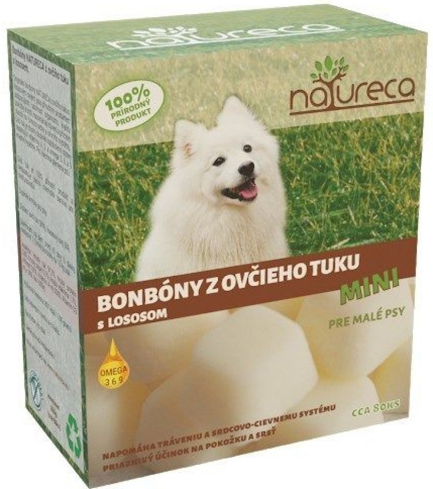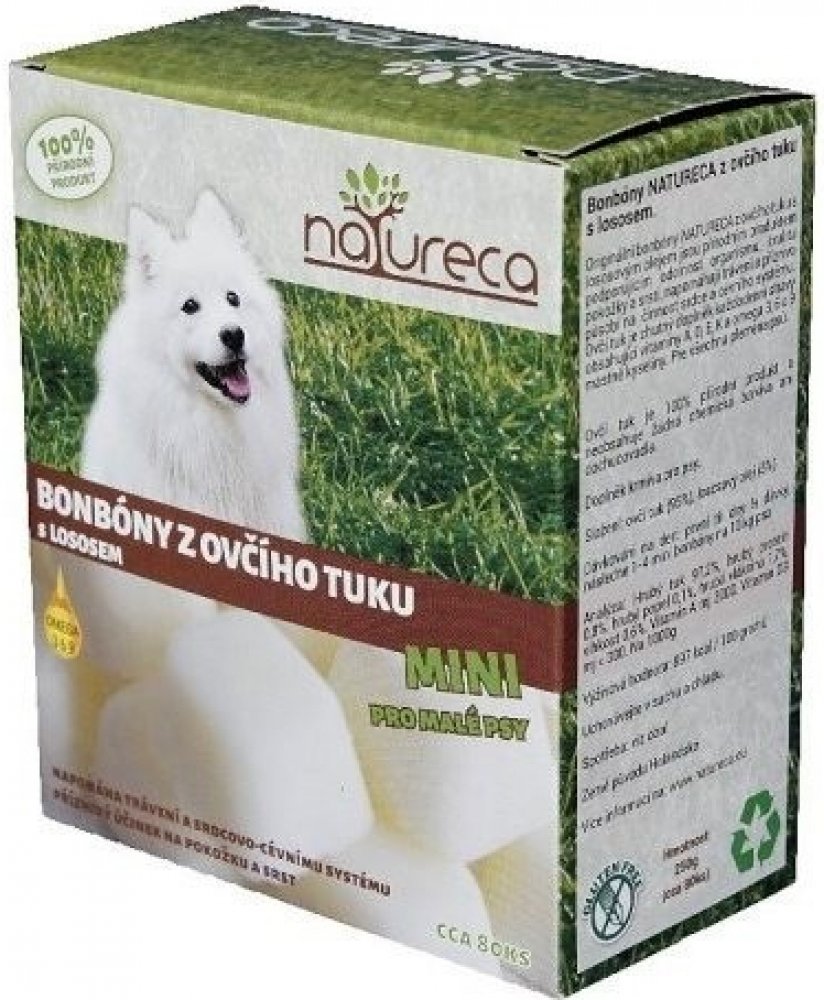 Originální bonbóny z ovčího tuku s lososem NATURECA jsou přírodním produktem podporujícím odolnost organismu proti parazitům (blechám a klíšťatům), zlepšují kvalitu pokožky a srsti, napomáhají trávení a podporují celkovou obranyschopnost organismu. Ovčí tuk je chutný doplněk stravy obsahující vitamíny A, D, E, K a omega 3, 6, a 9 mastné kyseliny.