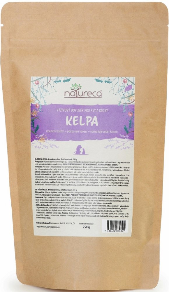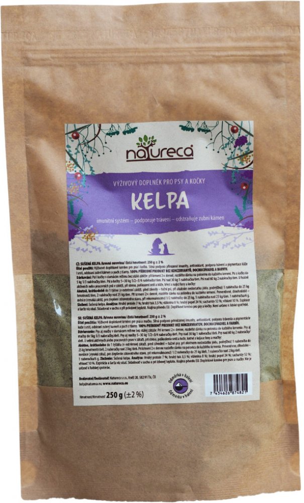 Sušená kelpa - 100% přírodní produkt bez konzervantů, dochucovadel a barviv. Slouží jako silná podpora přirozené imunity, antioxidant, podpora trávení, pigmentace kůže i srsti, odstraní zubní kámen a pach z tlamy. Výživové doplňkové krmivo pro psy i kočky. Baleno v uzavíratelném sáčku se zipem.