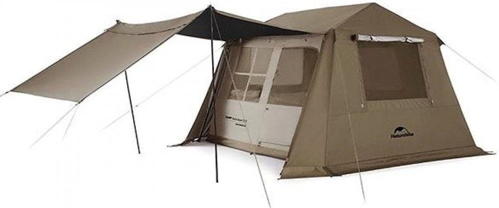 Stan je vyrobený z kvalitních a odolných materiálů. Sestavíte ho během několika málo minut. Integrovaný praktický přístřešek vás ochrání před sluncem nebo deštěm a rozšíří užitnou plochu o 6,8 m². Vysoký strop i velká okna zajistí optimální proudění vzduchu, síťky v oknech vás ochrání před obtížným hmyzem.