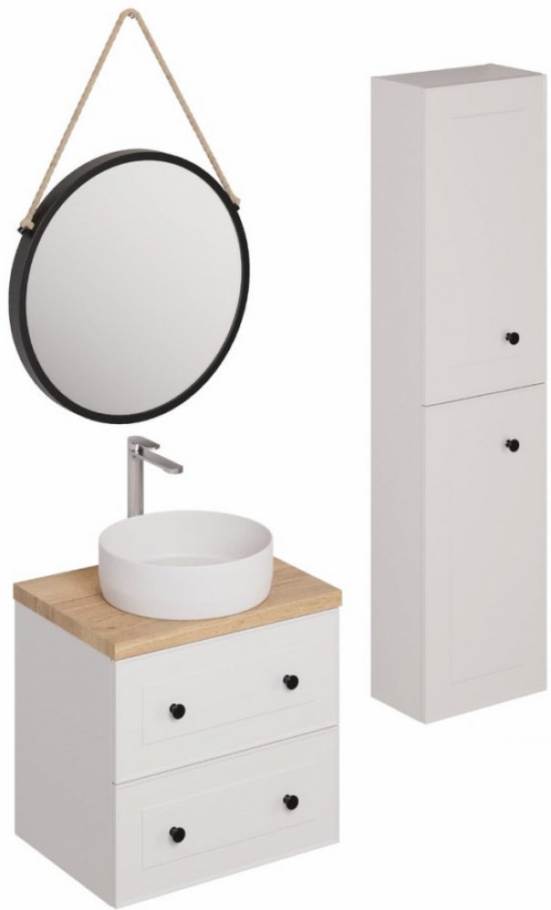 Koupelnová sestava s umyvadlem včetně umyvadlové baterie, vtoku a sifonu Naturel Forli je cenově zvýhodněný koupelnový set, který nabízí moderní a jednoduchý design. Skříňky jsou vyrobeny z kvalitního materiálu v bílé barvě, která dodává celé sestavě elegantní vzhled. Sestava nabízí dostatek úložného prostoru pro koupelnové potřeby. Umyvadlová baterie s chromovaným povrchem dokonale ladí s designem sestavy. Celkově se jedná o moderní a stylovou sestavu, která dokonale doplní vaši koupelnu. PopisKoupelnová skříňka vysoká Naturel Forli bílá - rozměry 40x157x20 cm. Povrch v provedení fólie. S dotahem dvířek. Dvířka mají levé i pravé otevírání. Koupelnová skříňka pod umyvadlo Naturel Forli bílá - rozměry 60x45x46 cm. Povrch v provedení fólie. Zrcadlo Naturel 40 cm černé - rozměry 40x60 cm. Zrcadlo má elegantní černý rám a je vhodné pro umístění nad umyvadlem.Umyvadlo na desku SAT Infinitio 39x39 cm. Umyvadlo disponuje šířkou 39 cm, výškou 13 cm. Umyvadlo je v bílém provedení a má kulatý tvar.Chromová vysoká umyvadlové baterie SAT Fusion.Pružná zátka SAT k umyvadlům bez přepadu.Multisifon umyvadlů úsporný do nábytku E660.PARAMETRY:Balení: s ksDruh výrobku: koupelnová sestava Barva popisná: bílá Barva základní: bílá Výbava: plnovýsuv s dotahem Povrch: fólie Balíček produktů: ano Cenově výhodný balíček: ano Provedení: závěsná Materiál umyvadla: keramika Série: Forli Značka: Naturel Záruční lhůta: 2 roky