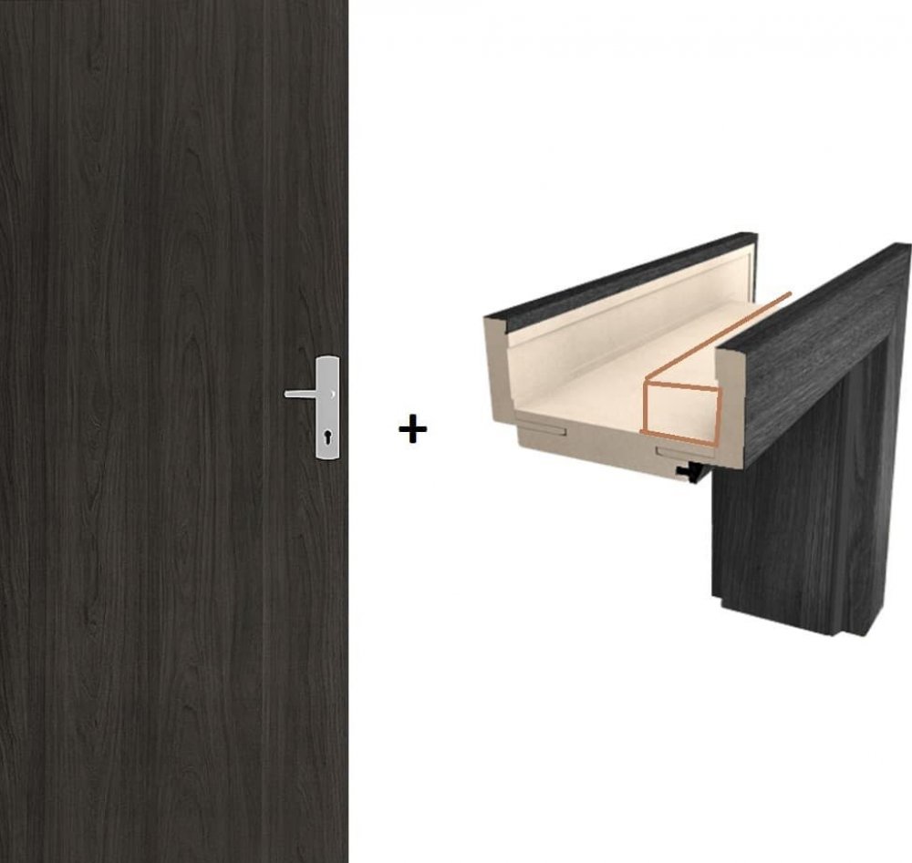 Set protipožárních dveří a zárubně. Pravé protipožární dveře o šířce 90 cm v dekoru jilm antracit. Stavitelná obložková zárubeň pro interiérové dveře. Ve standardní české normě na šířku stěny 14-16 cm.