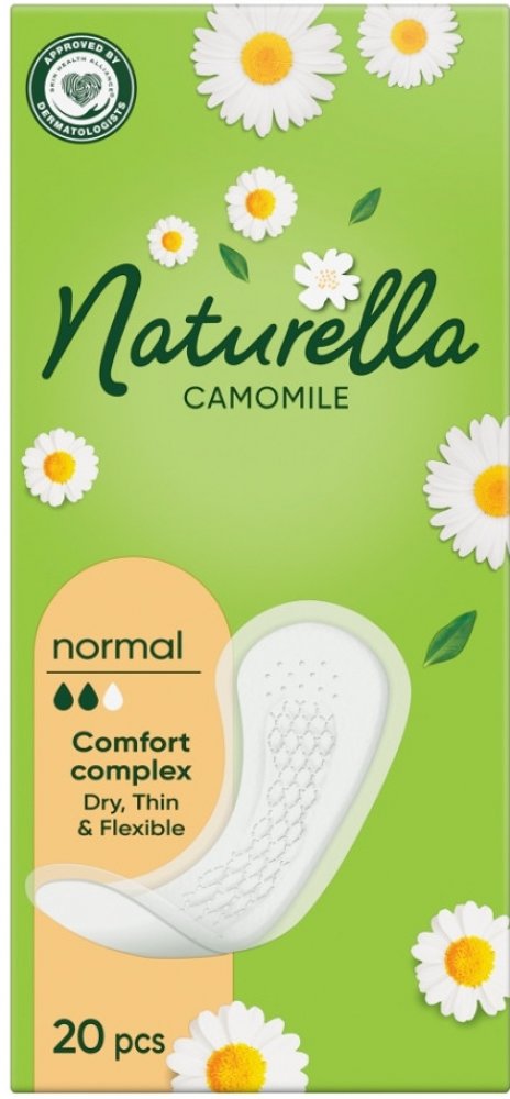 Pečuje o pokožku, schváleno dermatology, Slipové vložky s vrchní vrstvou ohleduplnou k intimní pokožce, 0,9 mm tenké, diskrétnost a pohodlí na každý den, Prodyšná vrstva a jemná vůně po heřmánku pro každodenní svěžest, Dermatologicky schváleno institutem proDERM (německý dermatologický institut s mezinárodním věhlasem) Se slipovými vložkami Naturella Normal Camomile se budete cítit svěží po celý den. Tyto prodyšné slipové vložky tenké jenom 0,9 mm mají vrchní vrstvu jemnou jako okvětní plátek a voní po heřmánku. Postarají se, abyste se každý den cítily pohodlně a svěží. Slipové vložky Naturella jsou schváleny institutem pro dermatologické testování proDERM. Nabídnou vám hygienickou péči pro ženy na každý den, které můžete důvěřovat. Slipové vložky Naturella vaše spodní prádlo skvěle chrání proti vaginálnímu a předmenstruačnímu výtoku nebo nepravidelné menstruaci. Během menstruace určitě vyzkoušejte vložky Naturella, které vám zajistí ještě lepší ochranu.
