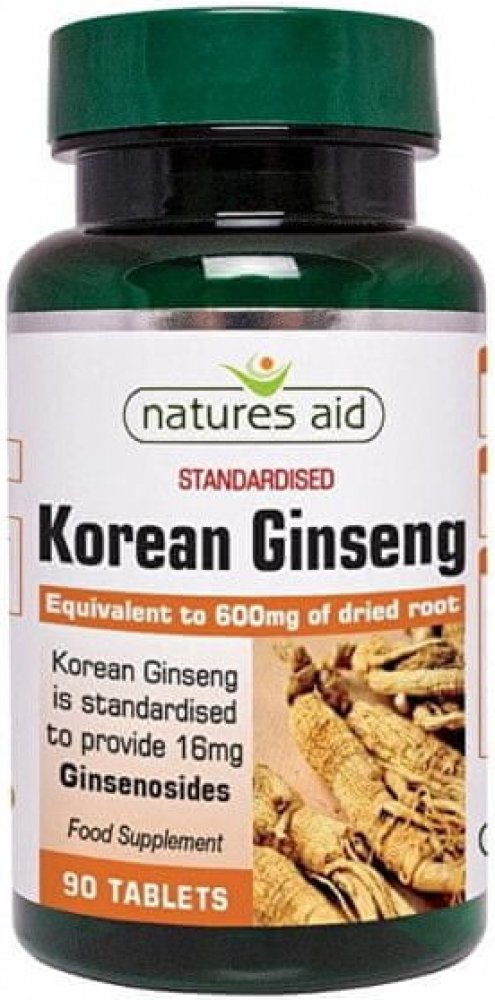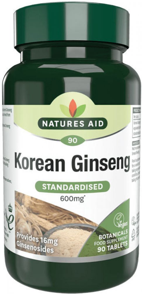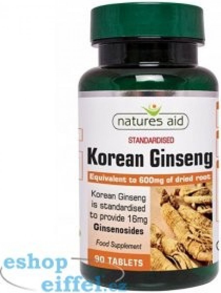Korejský ženšen od britské společnosti Natures Aid. Jedna tableta obsahuje 40 mg extraktu z kořene ženšenu pravého. Ženšen pravý podporuje kognitivní funkce, krevní oběh, přirozenou obranyschopnost, napomáhá při únavě a vyčerpání.