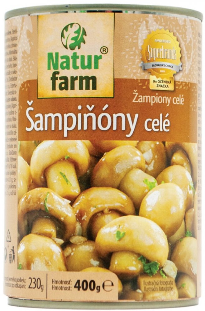 Žampiony celé ve slaném nálevuHmotnost: 400 gHmotnost pevného podílu: 230 gSložení: krájené žampiony (Agaricus biosporus), voda, sol, kyselina: kyselina citrónová; antioxidant: kyselina askorbováSkladování: skladujte v suchu a chraňte před teplem a mrazem. Po otevření skladujte v chladničce v nekovové nádobě a spotřebujte do 2 dnů. Uvedené informace se mohou lišit v závislosti na výrobcích.Výživové hodnoty na 100 gEnergie76 kJ / 18 kcalTuky0,4 gz toho nasyt. mast. kysel.