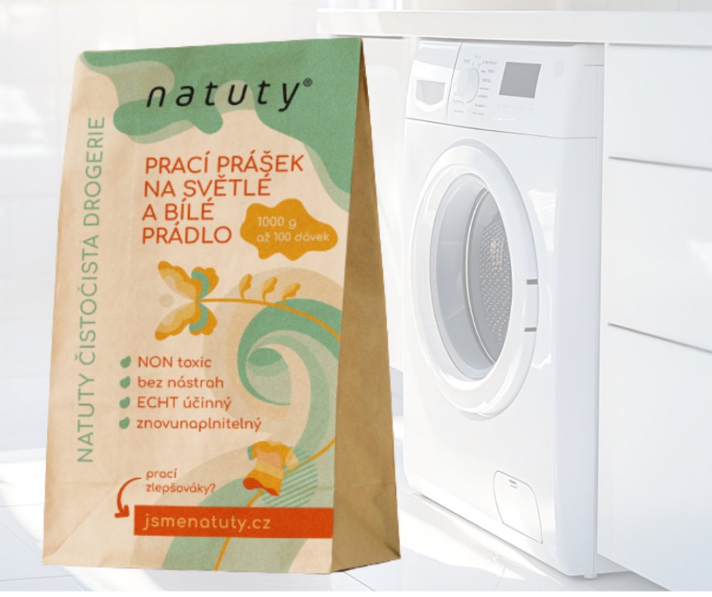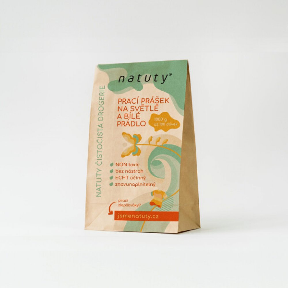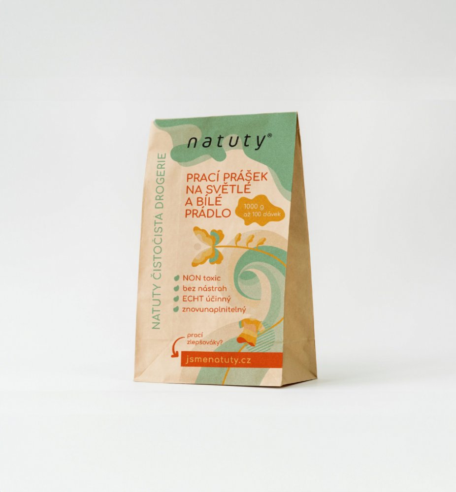 Natuty Prací prášek na světlé a bílé prádlo 1kg je až 100 pracích dávek netoxického prášku na praní, který byl speciálně vyvinut na světlé a bílé prádlo z bavlny, lnu, konopí a směsných vláken od 40-90ºC. Nevhodný na vlnu a hedvábí.