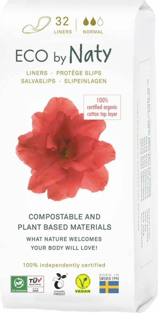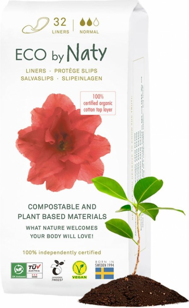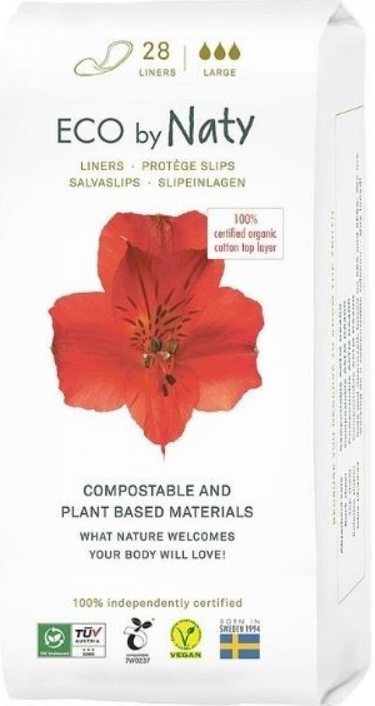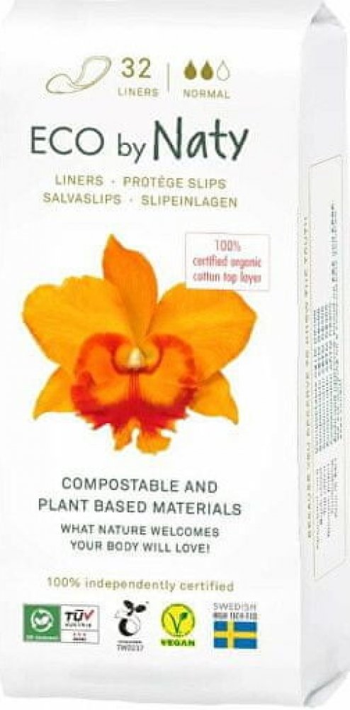 Balení obsahuje 28 ks dámských slipových vložek.Mají minimální dopad na životní prostředí a jsou šetrné k citlivé ženské pokožce. Vložky jsou vyrobeny z trvale udržitelných, environmentálně šetrných zdrojů a jsou 100 % biologicky odbouratelné, 100 % kompostovatelné.