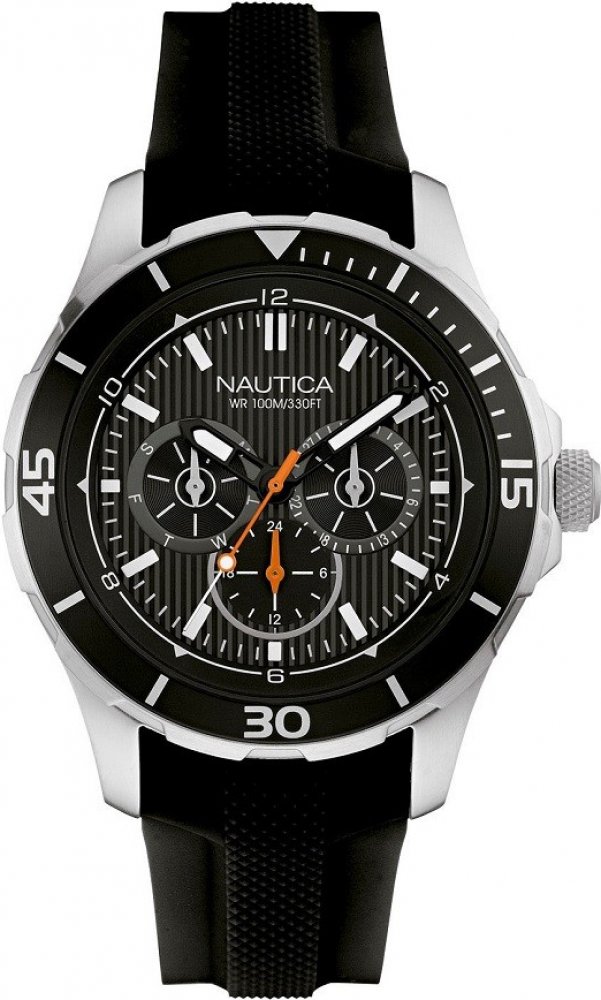 Nautica analogové silikon sportovní pánské bateriové - quartz pro potápění (100+ m) 45.0 mm ocel 54 x 45 x 13 mm 100 m bateriové 104.0 g minerální bez osazení NST 10 kulaté černá černá s luminiscencí trnová spona na ruku bez číslic stříbrná ocel 4.5 cm velké jednosměrně otočná 13.0 mm 13.0 mm 45.0 mm s dočasným svícením (luminiscence/LED) s nenáročnou údržbou (quartz) bez chytrých funkcí