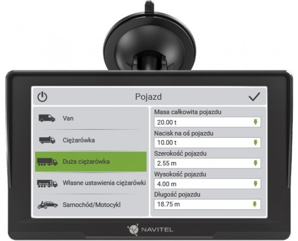 Program Navitel Navigator předinstalovaný v NAVITEL E777 TRUCK nabízí rozšířenou sadu nastavení pro navigaci nákladních vozidel. V nastavení vyberte typ nákladní dopravy nebo si vytvořte vlastní vozidlo přidáním jeho parametrů: délka, šířka, výška, maximální povolená a skutečná hmotnost, zatížení náprav atd., a program k tomu sestaví trasy s ohledem na silniční omezení.